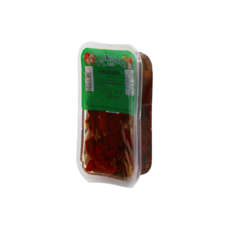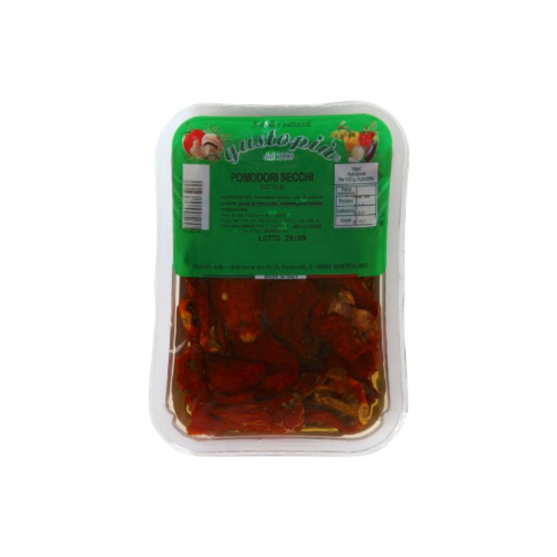 Die getrockneten Tomaten in Öl von der sizilianischen Firma Gustopiu' hergestellt, die seit über dreißig Jahren auf dem regionalen, nationalen und ausländischen Markt als einer der Marktführer im Bereich Gemüsekonserven, schwarze Oliven und Gemüse eingeführt und etabliert ist.